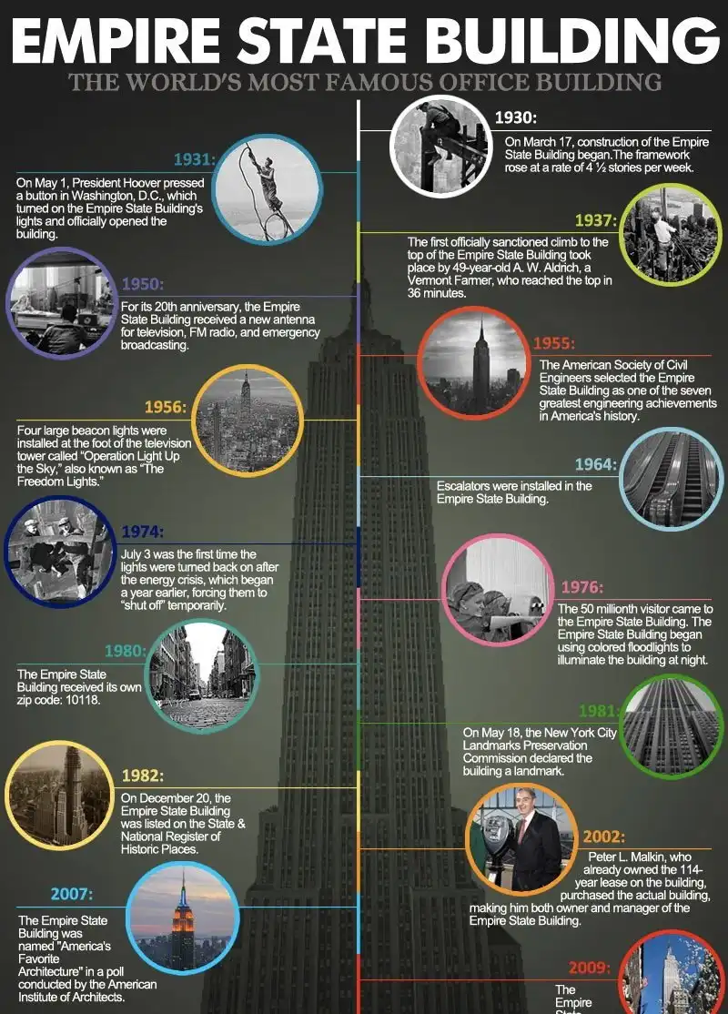 Небоскрёб Эмпайр Стейт Билдинг был первым зданием, имевшим более ста этажей. У него 6500 окон и 73 лифта, а с улицы до 102 этажа ведут 1860 ступеней. Общая площадь всех этажей составляет примерно 2768591 квадратных футов (257000м2); Основание ЭСБ имеет площадь примерно 2 акра (0.8га). В здании располагаются более тысячи организаций, оно имеет и свой почтовый индекс — 10118. По данным на 2007 год, каждый день в здании трудятся примерно 21000 служащих, что делает ЭСБ вторым по величине офисным комплексом в США, после Пентагона. Строительство небоскреба продолжалось один год и 45 дней. Изначально в нем было 64 лифта, расположенных в центре; на данный момент, в ЭСБ 73 лифта, включая служебные. Лифт поднимается на 86 этаж, где расположена смотровая площадка, менее чем за минуту. Суммарная длина труб небоскреба составляет 70 миль (113км.), длина электрических проводов — 2500000 футов (760000м.). Небоскреб отапливается паром под низким давлением; несмотря на огромную высоту, для отопления здание необходимо давление пара всего лишь два или три фунта на квадратный дюйм (от 0.14 до 0.21 кг. на см2). Небоскреб весит примерно 336000 тонн.