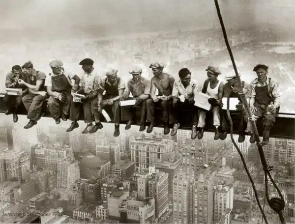 «Lunchtime atop a Skyscraper» (Обед на вершине небоскреба) — фотография из серии «Construction Workers Lunching on a Crossbeam — 1932″ фотографа Charles C. Ebbets