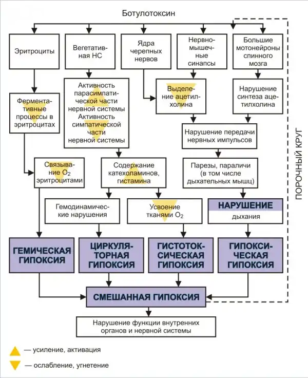 В зависимости от типа ткани нарушается холинергическая нервно-мышечная передача или холинергическая вегетативная передача импульсов к потовым, слезным, слюнным железам или к гладким мышцам. И хотя до конца этот процесс пока не изучен, данный механизм действия является наиболее вероятным. При обычной внутримышечной инъекции начало действия приходится на 2-3 сутки, максимум на 14-15 сутки, а через 45 суток эффект начинает медленно угасать. Блокада передачи импульса в синапсе является необратимой. Считается, что возобновление прохождения импульса через синаптическую щель происходит за счет образования новых коллатералей у нервных волокон. Таким образом, вся поперечнополосатая мускулатура, гладкие мышцы и потовые железы являются потенциальными органами — мишенями для лечения ботулиническим токсином. Ботулинический токсин в течение некоторого времени концентрируется в месте его внутримышечного введения, где подвергается частичному метаболизму, затем попадает в системный кровоток. В организме он очень быстро метаболизируется с образованием более простых молекулярных структур. Выводится в виде метаболитов преимущественно почками.