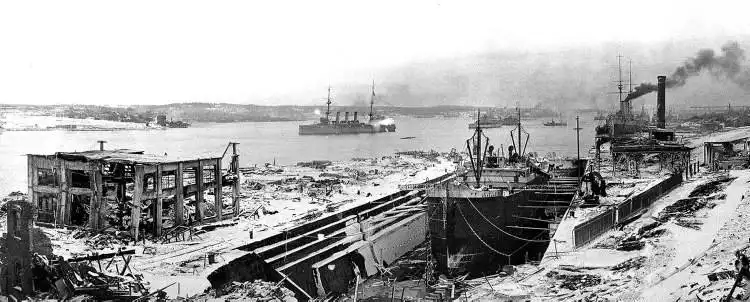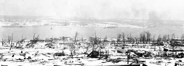 6 декабря 1917 года в гавани канадского города Галифакса произошел невероятно мощный взрыв. Французский военный транспорт «Монблан», груженный практически одной только взрывчаткой, врезался в норвежский корабль «Имо». На судне произошел пожар, который привел к взрыву, разрушившему порт и немалую часть города. Предположительно 2 000 человек погибли под развалинами и из-за пожаров, бушевавших после взрыва. Примерно 9 000 человек получили ранения, 400 человек потеряли зрение. Взрыв в Галифаксе включили в число мощнейших взрывов, устроенных человечеством, данный взрыв значится самым сильным взрывом до появления ядерного оружия.