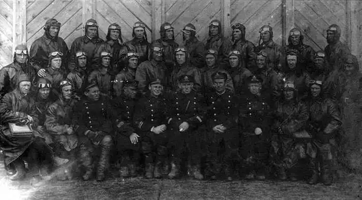8-я дальнеразведывателышя эскадрилья в полном составе. В центре (с забинтованным пальцем) комэск
