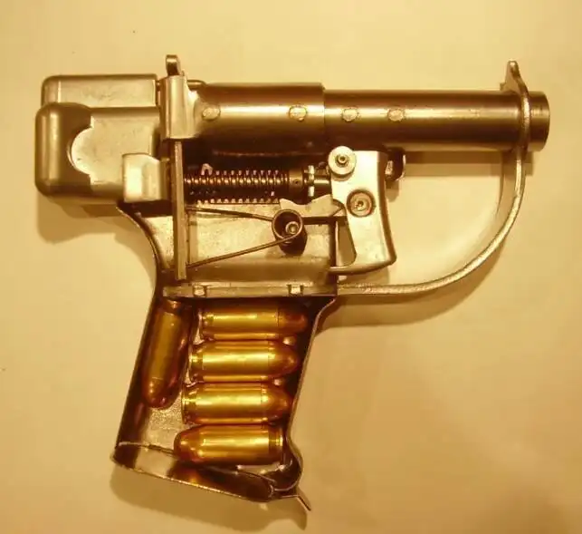 Предлагали для применения двухзарядный пистолет, в котором имелся подвижный горизонтально расположенный блок патронников, размещенный за стволом под патрон 0.45 ACP. После первого выстрела, патронник перемещался, ударник взводился и пистолет был готов ко второму выстрелу.