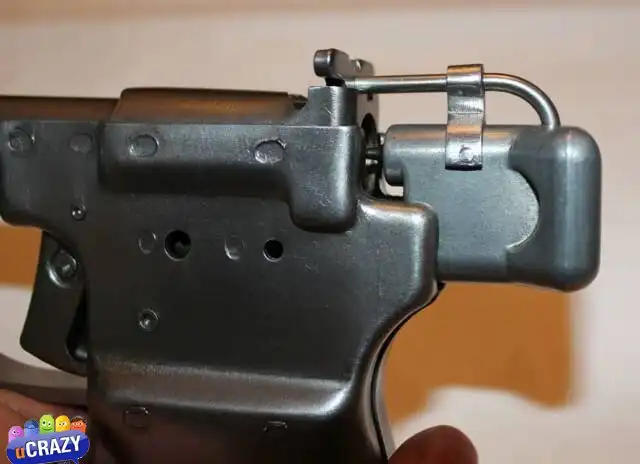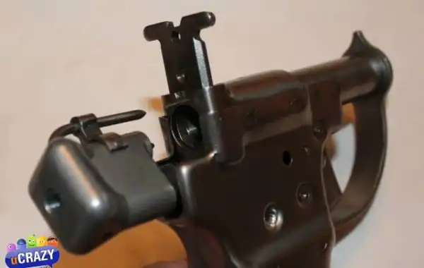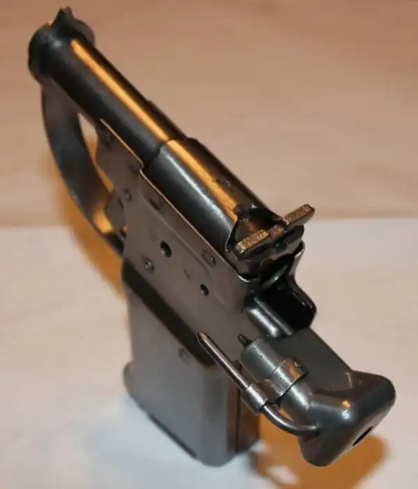 Рукоятка пистолета в нижней части имеет сдвижную крышку под которой в полости размещают 10 запасных патронов (8 горизонтально и 2 вертикально).