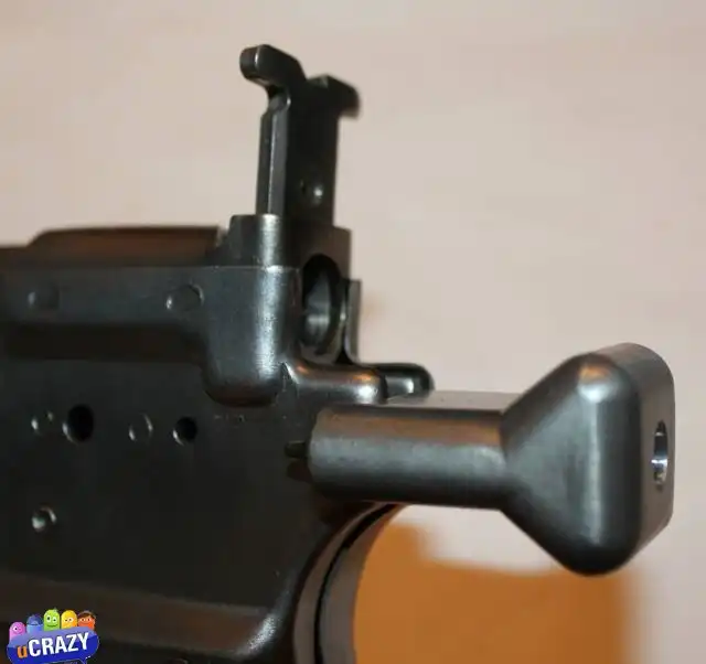 Затвор выполнен в виде простой пластины, которая перемещается вертикально и в нижнем положении запирает канал ствола. Пластина имеет в верхней части прорезь которая служит целиком. В центральной части пластины имеется отверстие для ударника.