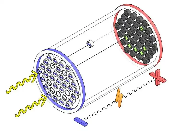 В преобразователе происходит все самое главное. Он представляет собой запаянную трубку, из которой откачан воздух. На переднюю стенку трубки нанесен тонкий слой полупроводника, а на заднюю — люминисцирующее вещество (люминофор). К трубке преобразователя прикладывают напряжение таким образом, что передняя стенка заряжена отрицательно (катод), а задняя — положительно (анод). Поскольку в катоде избыток отрицательно заряженных электронов, они хотят из него выбраться и притянуться к положительно заряженному аноду, но напряжения чуть-чуть не хватает, чтобы вырвать их из полупроводника.