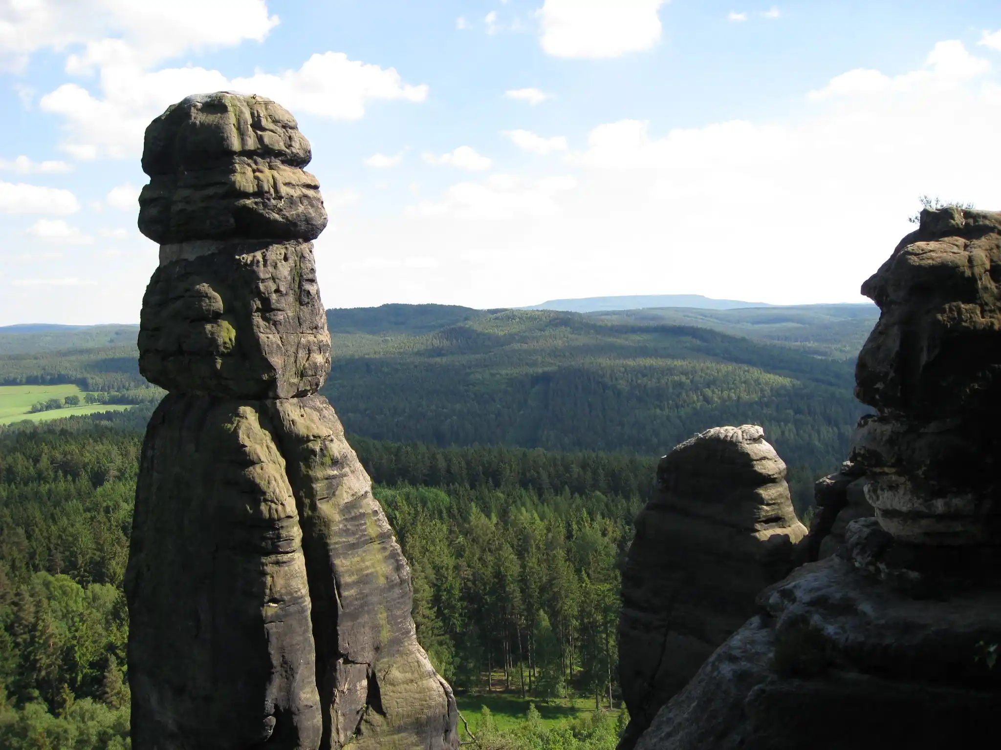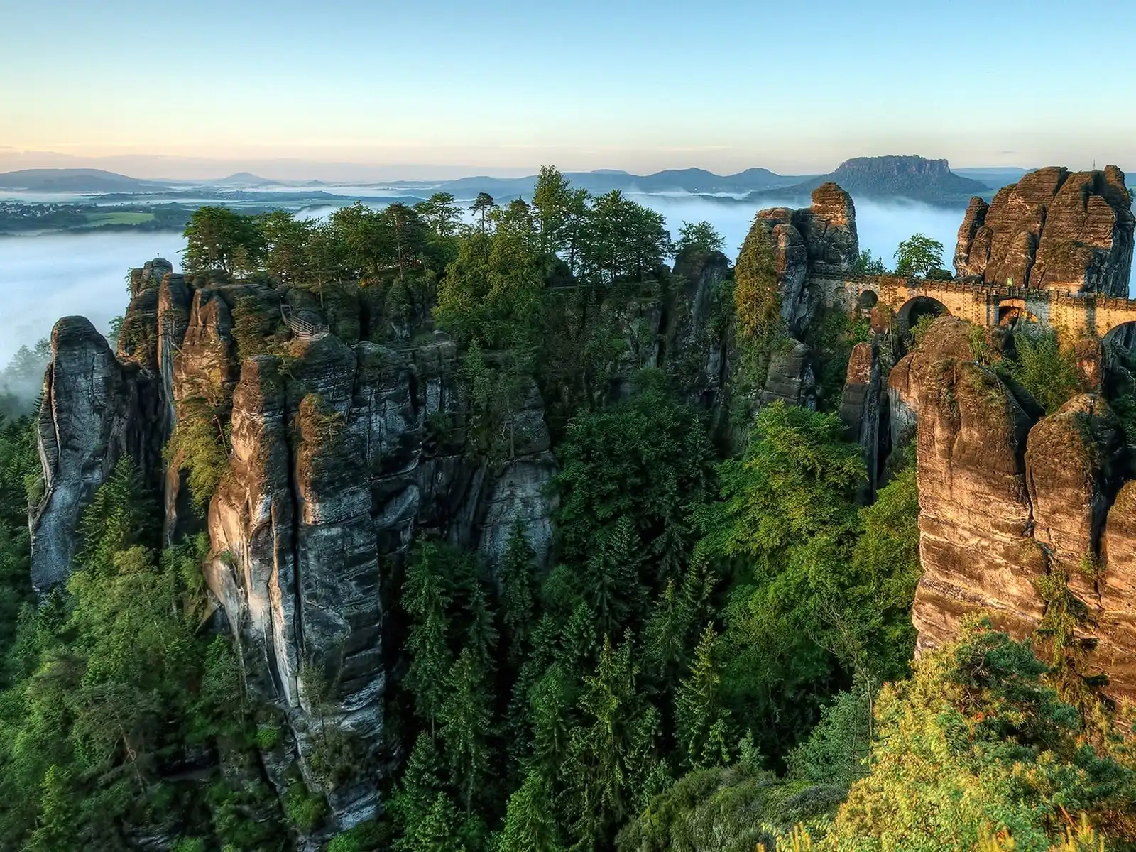 Отвесные скалы самых причудливых форм напоминают игрушки великана: кегли, столбы и пирамиды. На высоте около 200 метров возникает ощущение, что весь мир остался далеко внизу, а ты будто паришь над Эльбой вместе с птицами, и легкие облака медленно проплывают у тебя под ногами. Кажется, только раскинь руки – и полетишь! Вот именно от таких восторженных туристов и были установлены на Бастае защитные перила. Впрочем, это не мешает опытным скалолазам со всей Европы покорять здешние утесы.