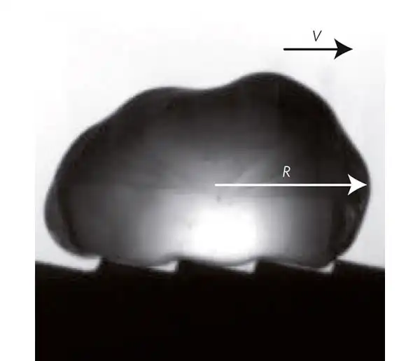 Сразу отметим ключевой момент пионерского исследования: наблюдаемое перемещение капли фреона R-134a происходило лишь на специально приготовленной подложке (как на рис. 3) с периодической несимметрично рифленой структурой. Нестационарное поведение объекта первооткрыватели явления ошибочно связали с тем, что подложка по-разному деформирует каплю и создает неодинаковое лапласовское давление на ее краях и в той ее части, которая расположена на зубце. Образовавшийся таким образом градиент давления Лапласа заставляет каплю смещаться.