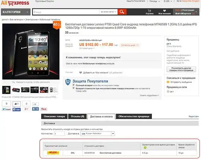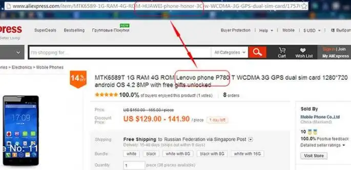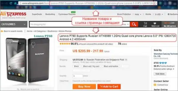 На скриншоте видно, что название товара в адресе страницы и на самой странице явно не совпадают. А это значит, что на странице, ранее созданной для продажи телефона Huawei, сейчас размещено объявление о продаже телефона Lenovo P780. Причем цена на телефон явно осталась от Huawei, да и на фото представлен тоже не Lenovo. Сделана такая хитрость с одной простой целью – для того что бы данный товар отображался выше в поиске при сортировке по цене. А поиск производится как раз по наименованию товаров. Т.е. если покупатель ищет телефон Lenovo P780, и хочет его купить по максимально низкой цене, то это объявление он увидит одним из первых.