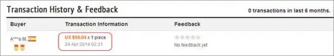 Обратите внимание на цену. В разделе Transaction History & Feedback цена на купленный товар всегда отображается без учета скидок. В этом то собственно и кроется вся хитрость продавца. В момент, когда будет набрано необходимое количество записей о продаже с такой ценой, скидку с товара просто уберут и на странице товара будет видно, что якобы этот плащ какое-то количество человек уже купило и именно по цене в $50.04. Т.е. новый покупатель снова будет введен в заблуждение. Ну а те покупатели, кто поучаствовал в этом спектакле, в лучшем случае получат возврат своего одного доллара, при условии, что они еще и потратят свое время на открытие спора.