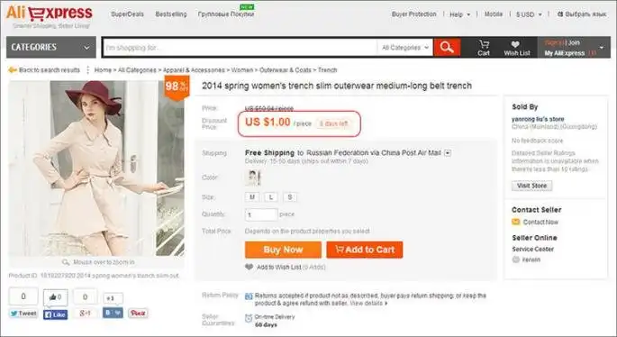 На странице товара видно, что продается женский плащ, цена которого $50.04, но поскольку проходит акция со скидкой, то цена стала всего $1 и при этом еще и бесплатная доставка. Казалось бы – находка для шопоголика! Но не все так просто.