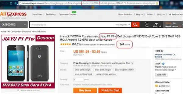 В итоге получается, что цифра в 244 продажи относится вовсе не к продажам телефона Jiayu F1, который мы видим изначально на странице товара, а к суммарным продажам телефонов Jiayu F1, Jiayu G2 и Lenovo A750, которые ранее продавались с этой же страницы.
