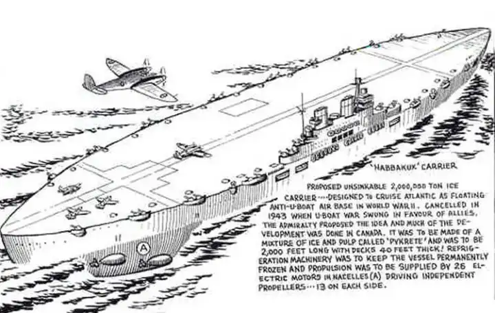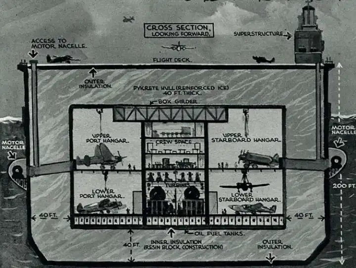 Таяние такого «корпуса» не стало бы проблемой в операции, которая могла занять считанные дни или недели, к тому же – немного замедлить его можно было с помощью мощных холодильных установок. Чуть позднее идея трансформировалась. Британский инженер и учёный Джеффри Пайк (Geoffrey Pyke), сотрудник ведомства Маунтбаттена, предложил собирать боевые корабли из замороженных ледяных блоков, встраивая в конструкцию трубы холодильных установок.