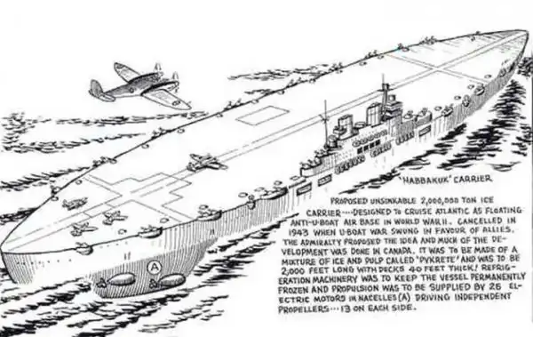 Конечно, Пайк не был первым, кто предложил использовать айсберг или льдину как пункт промежуточной остановки для самолетом и даже не первым, кто предложил, что такой плавучий остров может быть сделано из искусственного льда. Еще в 1930 году немецкий ученый Герке провел ряд таких экспериментов на Цюрихском озере, а в 1940 году такая идея почти всерьез рассматривалась все в том же британском Адмиралтействе.