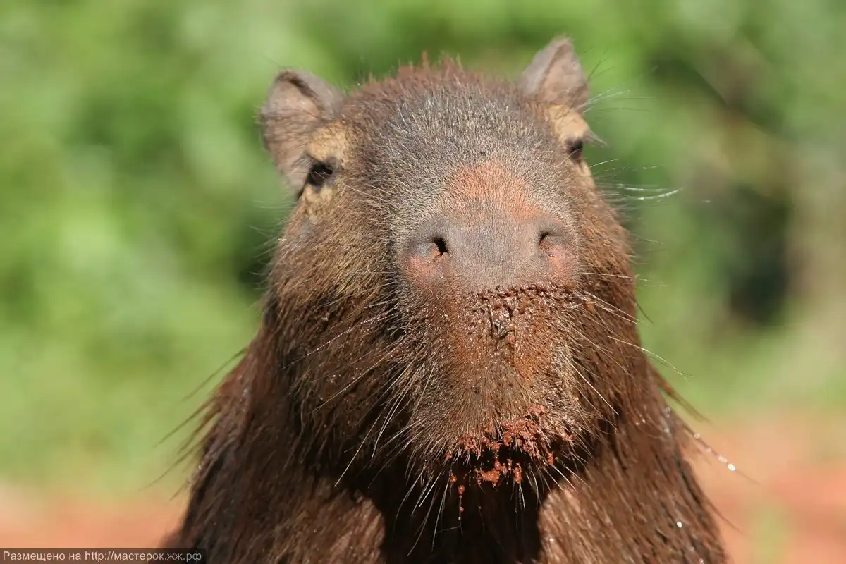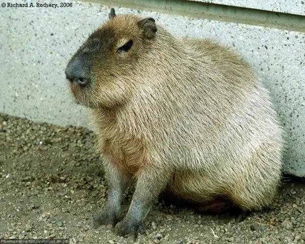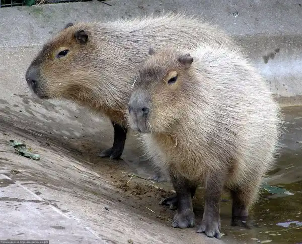 Капибара – это водосвинка, самый крупный современный грызун в мире. Водится она в центральной части Южной Америки. Живет на берегах водоемов и на лесных болотах. Прекрасно плавает и значительную часть времени проводит в воде. Несмотря на большие размеры этого животного, в Южной Америке широко распространено его одомашнивание. Длина тела капибары достигает полутора метров, вес – шестидесяти килограмм. Животное трудно сравнить с каким-то другим зверем, но внешне она напоминает морскую свинку – похожая симпатичная мордочка, небольшие уши, чувствительный нос. Задние лапы капибары имеют по три пальца, передние – по четыре, причем между пальцами у нее, как у множества водоплавающих имеются перепонки.