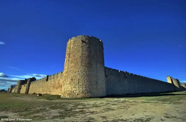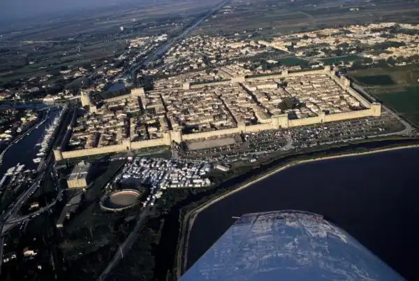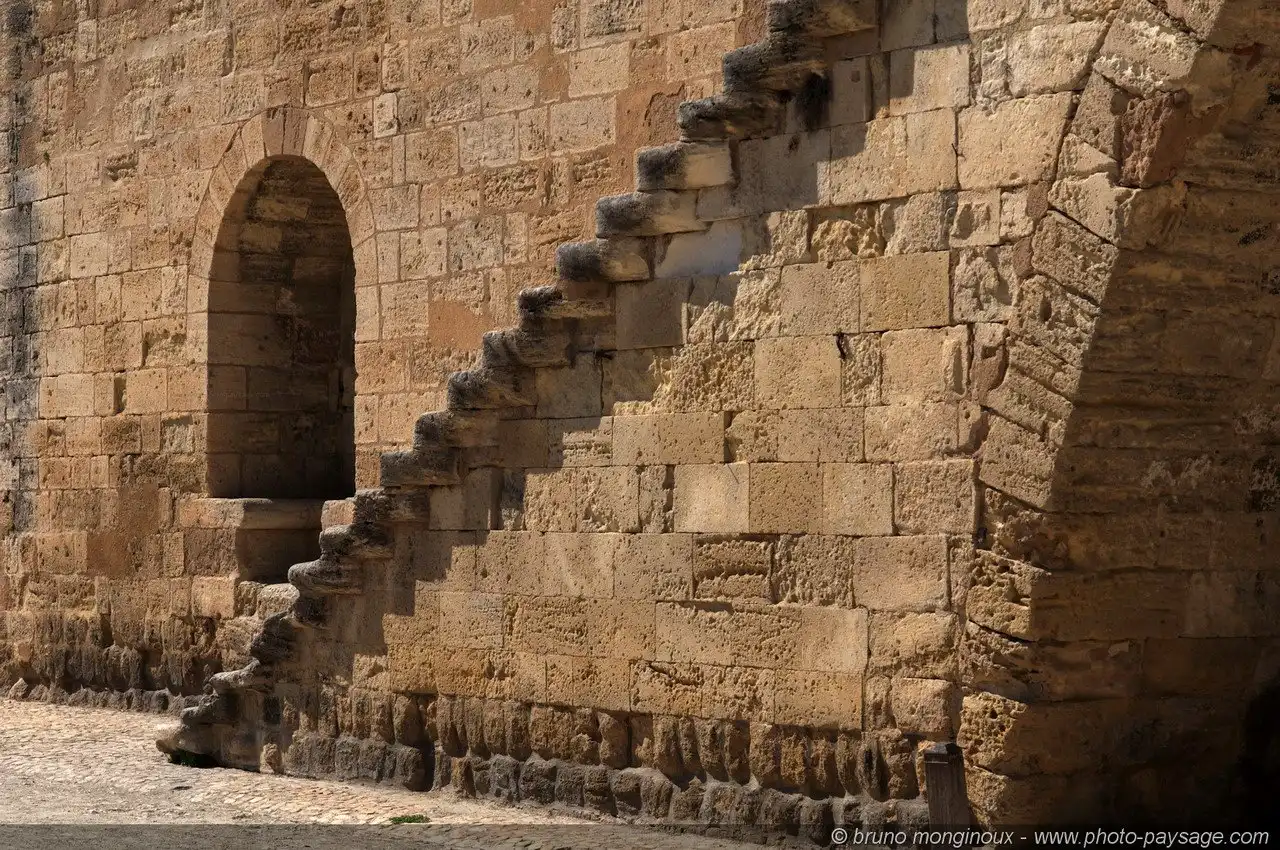 В 1248 г. началось возведение крепостных стен под руководством архитекторов-генуэзцев Гульельмо Бокканегра и Никола Коминелли, однако завершены работы были только в конце XIII – начале XIV веков, при Филиппе III Смелом и Филиппе IV Красивом. Общая протяжённость укреплений составила 1640 метров, стены толщиной 3 метра вознеслись на высоту 11 метров, крепость обороняли двадцать мощных башен, внутрь вели десять хорошо охраняемых ворот.