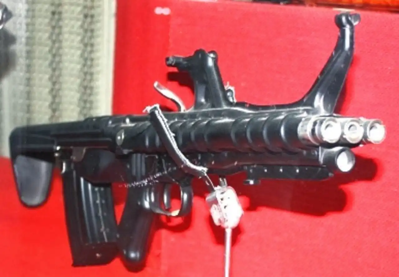 Наверное «динозавры» еще помнят эту игру (ох, а сколько мы в нее намотали на первом уровне по сетке), так вот там был вот такой трехствольный автомат. Сегодня узнал, что это оружие есть в реальности.