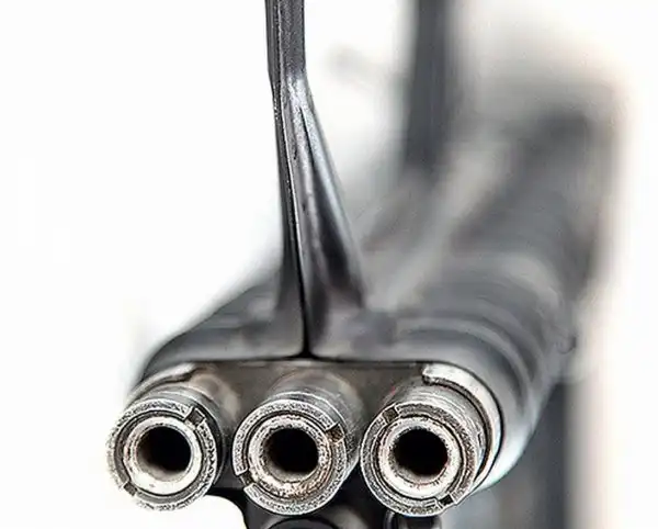 Вывод стреляных гильз и отработанных газов осуществляется вперед к дульному срезу стволов.