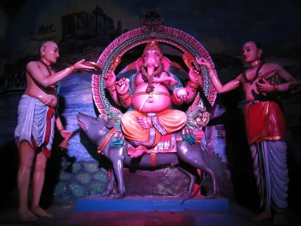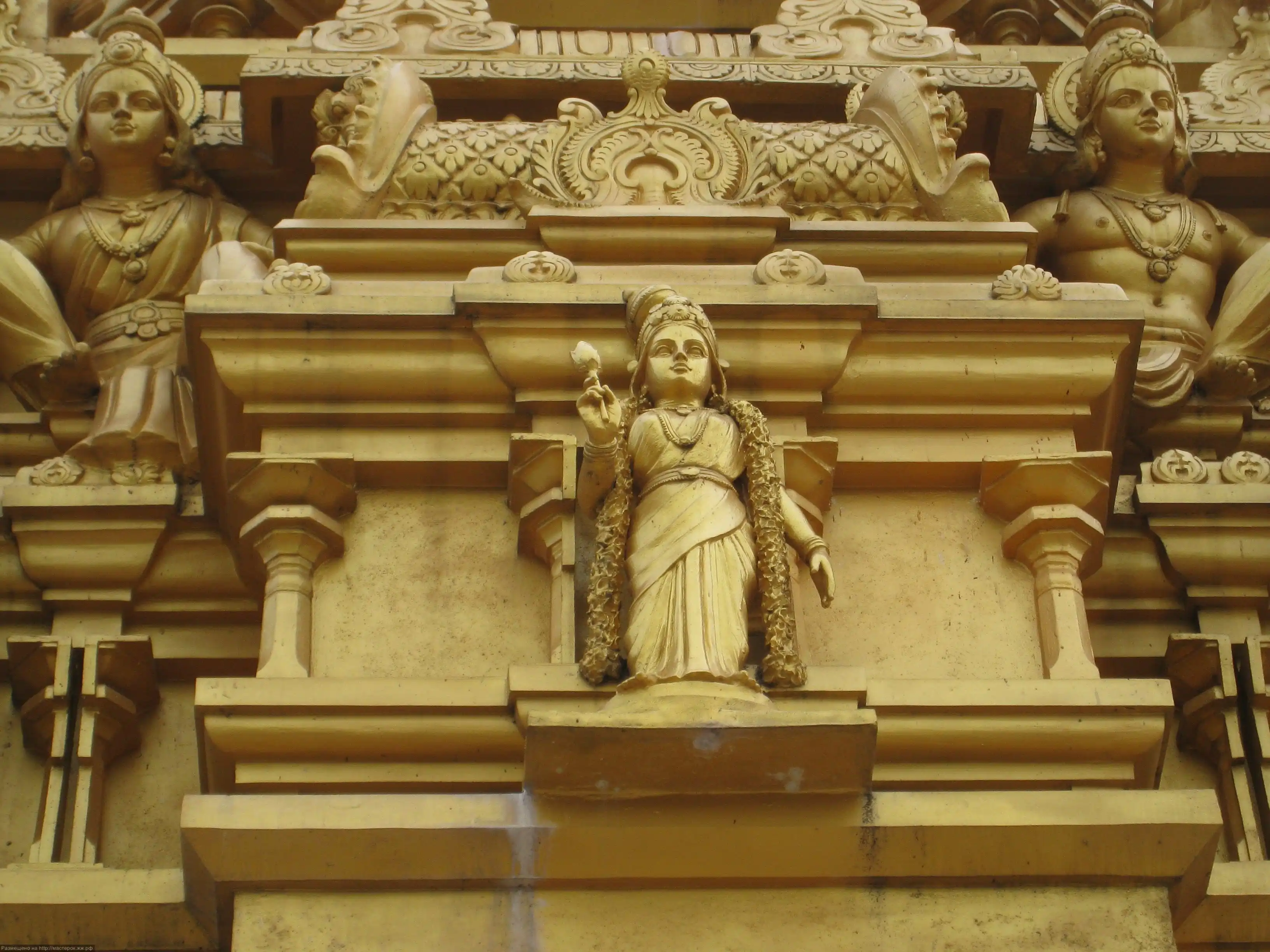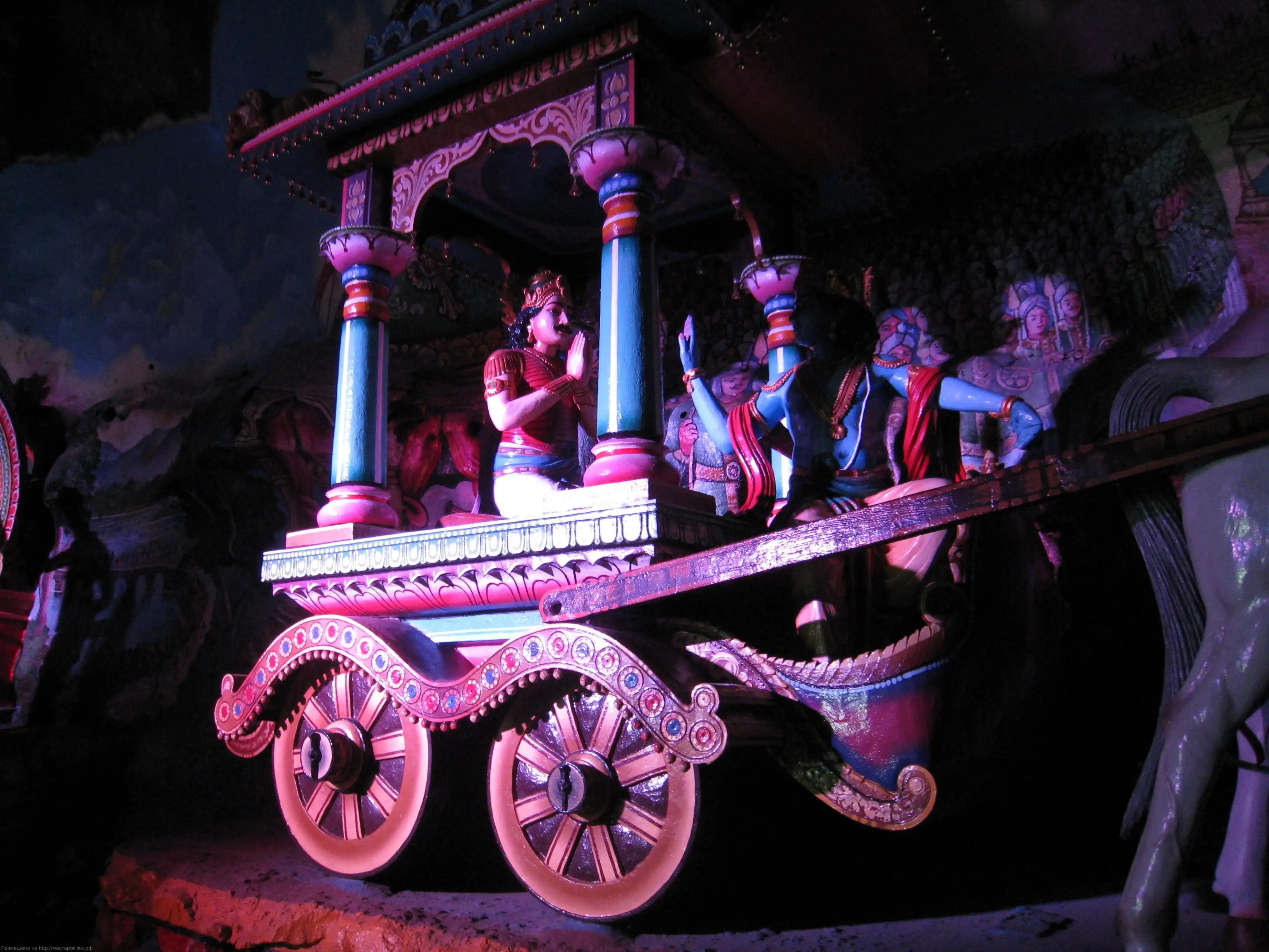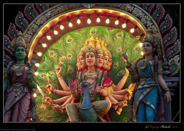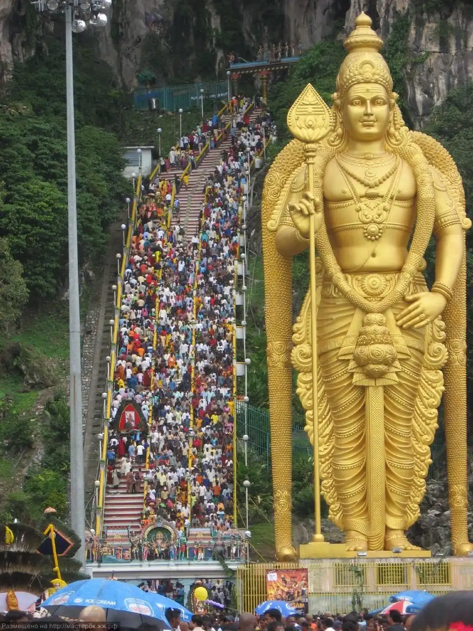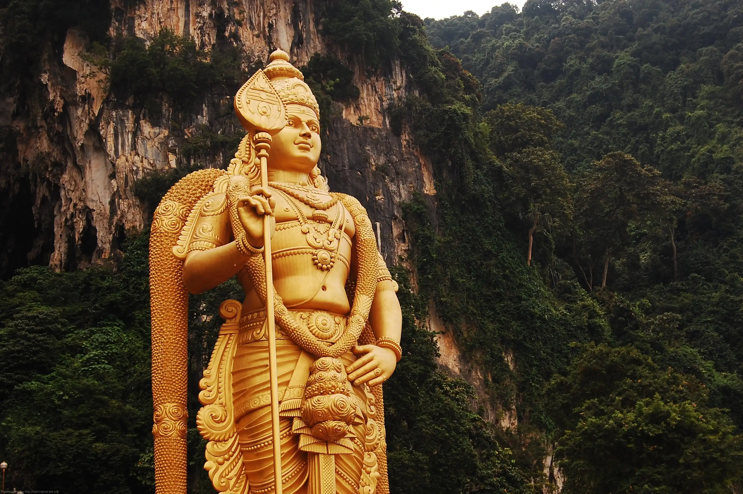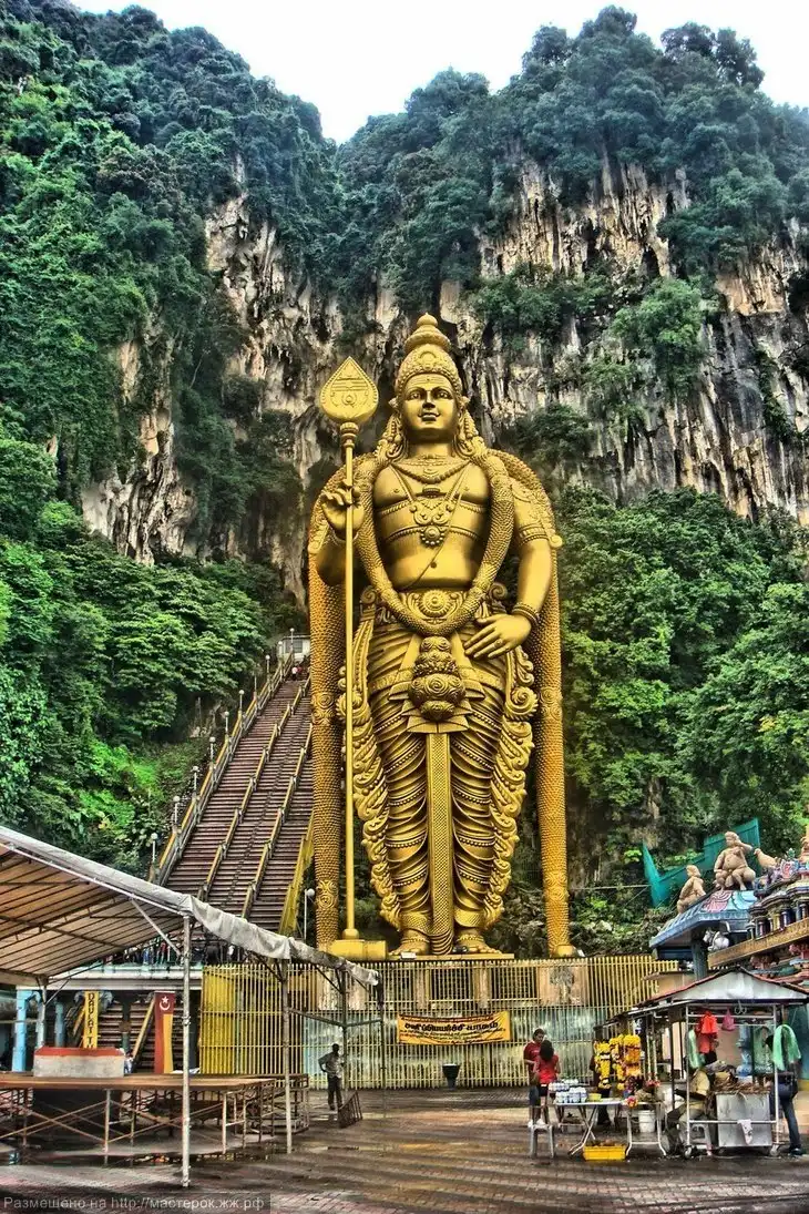 Где-то пишут, что это статуя Будды (и при чем здесь вообще Будда?), но на самом деле это божество Муруга, которому когда-то посвятил пещеры торговец Пиллаи. Статую вояли 3 года 15 индийских скульпторов, 15 местных художников и архитекторов из тонн бетона, арматуры и трехсот литров тайской золотистой краски. Статую водрузили на почетное место у подножия пещер в 2005 году.