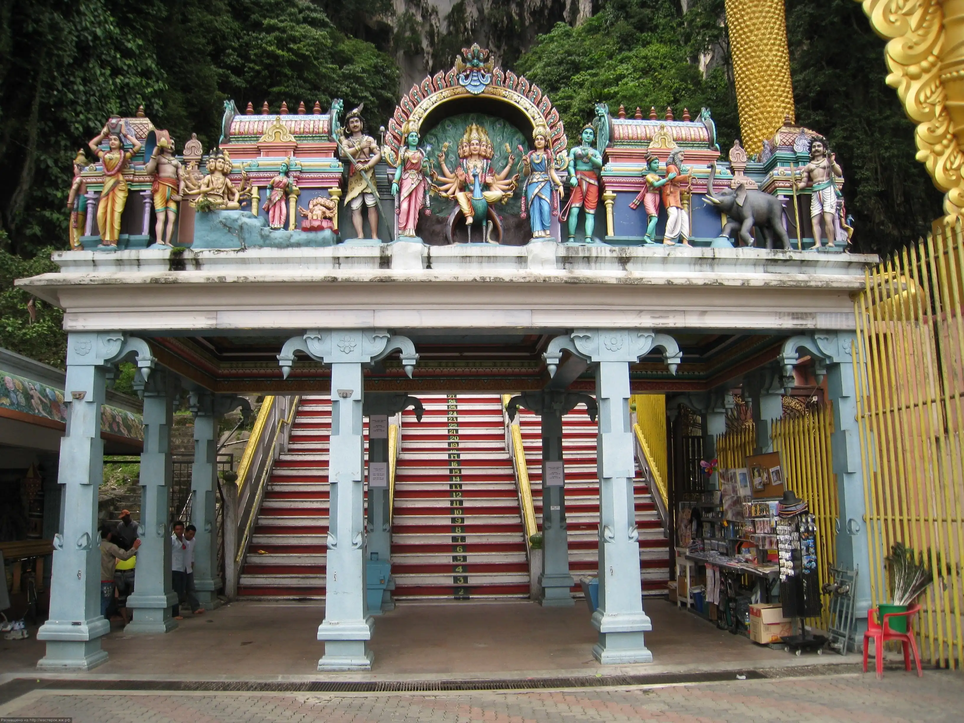 Чтобы достигнуть ее, посетители должны подняться по крутой лестнице из 272 ступеней. По ним поднимается целая процессия во время праздников Огня, проходящих в октябре и ноябре, и в праздник божества Муруга в феврале каждого года. При входе в комплекс стоят огромные статуи. Первая, которая встречается на пути – позолоченная статуя бога Муруга сорока трех метров высоты (была представлена в январе 2006 года, после 3 лет, потраченных на сооружение, это - самая высокая статуя бога Муруга в мире).