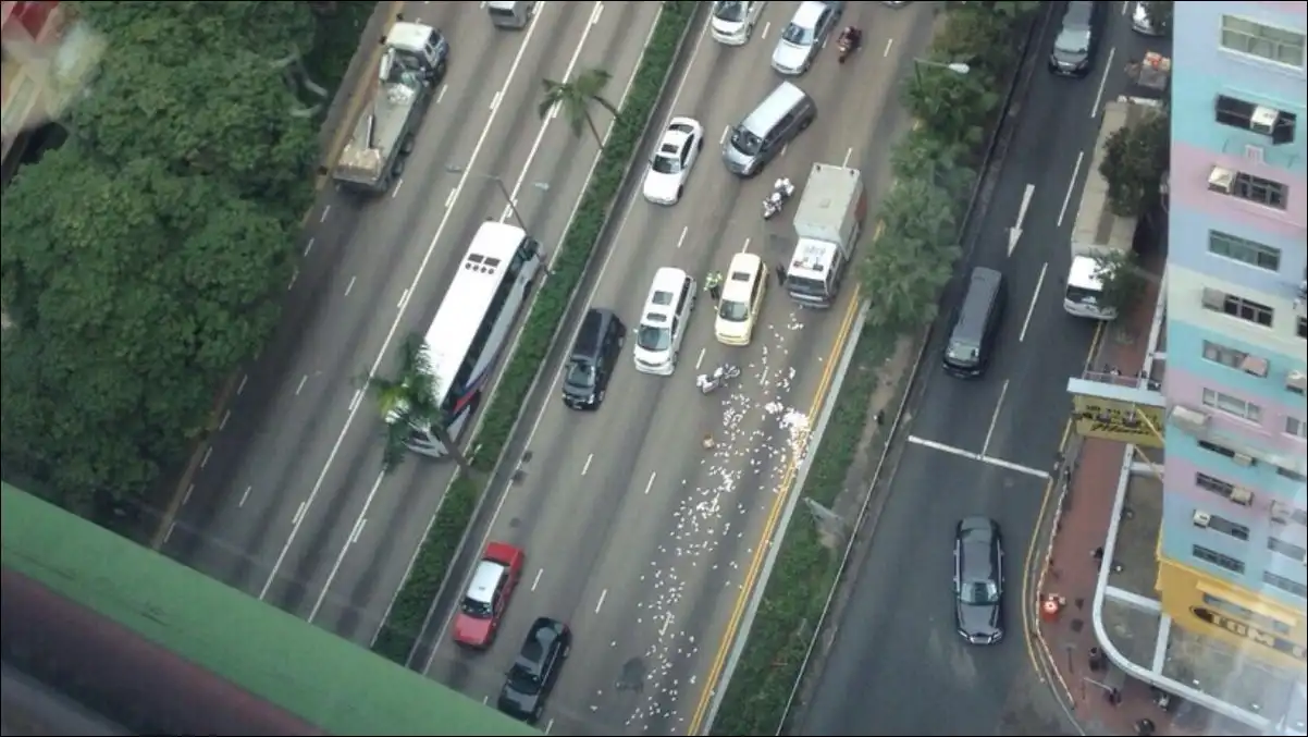 Фургон попал в аварию на одной из главных улиц города — Gloucester Road в районе Ваньчай в обеденное время, сообщает SCMP. После аварии на улице образовались огромные заторы: водители выскакивали из машин, пытаясь набрать побольше денег.
