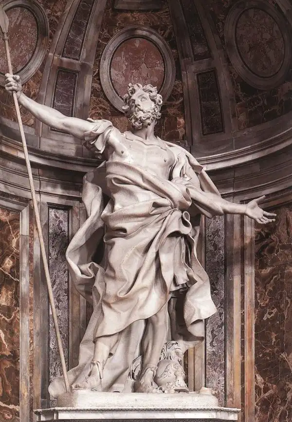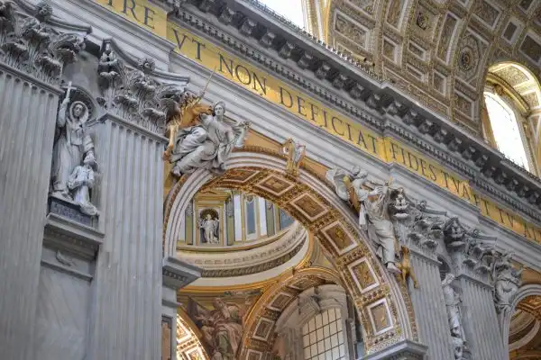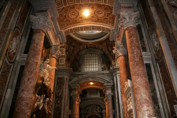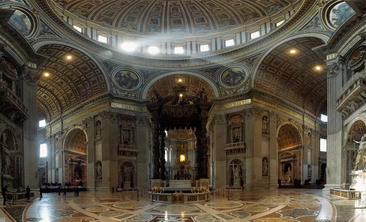 Купол, шедевр архитектуры, имеет внутри высоту 119 м и диаметр 42 м. Он опирается на четыре мощных столба. В нише одного из них стоит пятиметровая статуя св. Лонгина работы Бернини. Роль Бернини в создании скульптурного убранства собора очень велика, он работал здесь с перерывами почти пятьдесят лет, с 1620-го до 1670 г. В подкупольном пространстве над главным алтарём находится шедевр Бернини — огромный, высотой 29 м балдахин (киворий) на четырёх витых колоннах, на которых стоят статуи ангелов. Среди ветвей лавра на верхних частях колонн видны геральдические пчелы семейства Барберини.