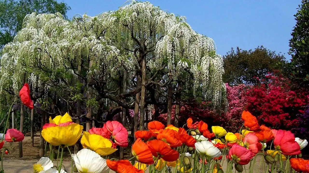 Парк цветов, как правило, в полном цветении в начале мая, на две недели позже, чем проходит цветение глициний в Токио.