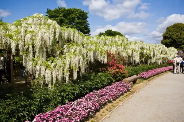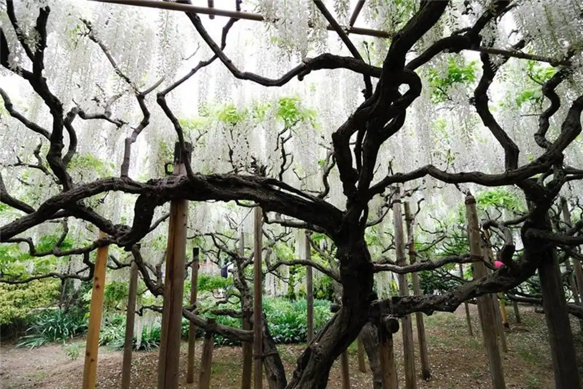 Для столетней глицинии парком создан огромный каркас для поддержки огромного зонтика фиолетово-синих цветов (глициния относиться к лиановым очень хорошо формируется). Существует также длинный туннель белой глицинии, а туннелю желтого ракитника kingusari потребуется еще много лет, чтобы стать фактическим туннелем (пока это как навес).