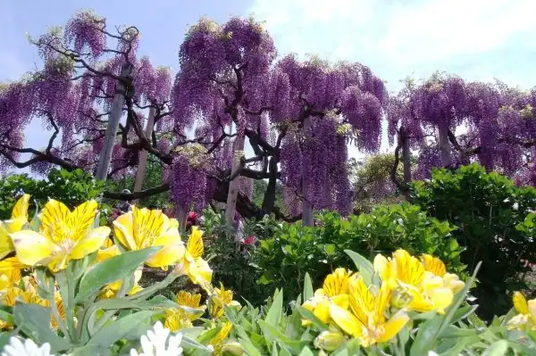 В парке цветов Асикага особенности много голубых, белых и розовых глициний, а также желтого ракитника (на японском: kingusari), которые выглядят как желтые глицинии.