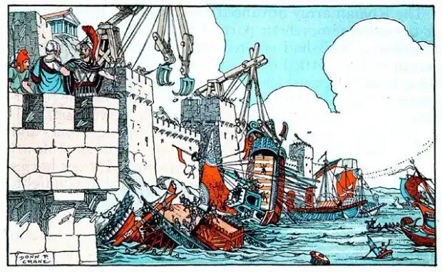 Плутарх утверждает, что Архимед при помощи своих машин с такой точностью метал громадные тяжелые камни, что они каждый раз попадали в намеченную цель; с таким же успехом действовали и построенные им метательные машины меньшего размера. Рассказывают, что осажденные метали против кораблей тяжелые снаряды, снабженные крюками и канатами, при помощи которых корабли притягивались к стенам, приподнимались кверху за нос или за корму, после чего резко опускались, что причиняло им серьезные повреждения.