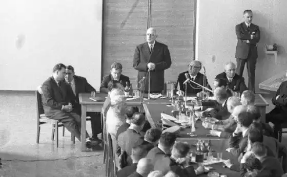 Слева направо: Ф.С. Горячев, Ю.Е. Нестерихин, Ш. Де Голль, М.А. Лаврентьев, Н.В. Подгорный.