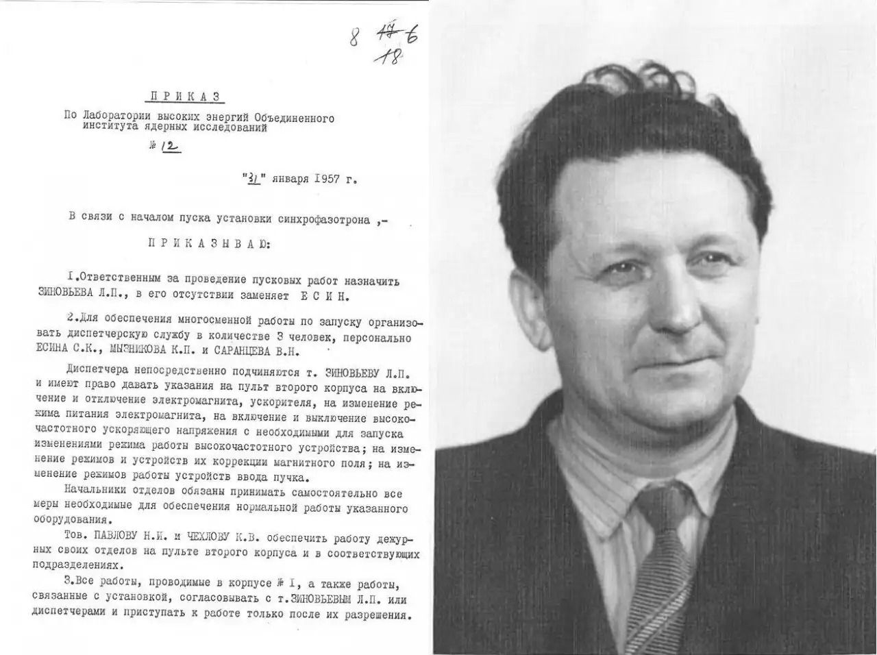 В состав группы, переведенной из Лаборатории «В», входил инженер Леонид Петрович Зиновьев. Он, как и другие члены ускорительной группы, в лаборатории Лейпунского сначала занимался разработкой отдельных узлов, необходимых для модели будущего ускорителя, в частности ионного источника и высоковольтных импульсных схем для питания инжектора. Лейпунский сразу обратил внимание на грамотного и творческого инженера. По его указанию Зиновьева первым привлекли к созданию опытной установки, в которой можно было смоделировать весь процесс ускорения протонов. Тогда никто не мог предположить, что, став одним из первопроходцев в работе по воплощению идеи синхрофазотрона в жизнь, Зиновьев окажется единственным человеком, который пройдет все этапы его создания и совершенствования. И не просто пройдет, а возглавит их.