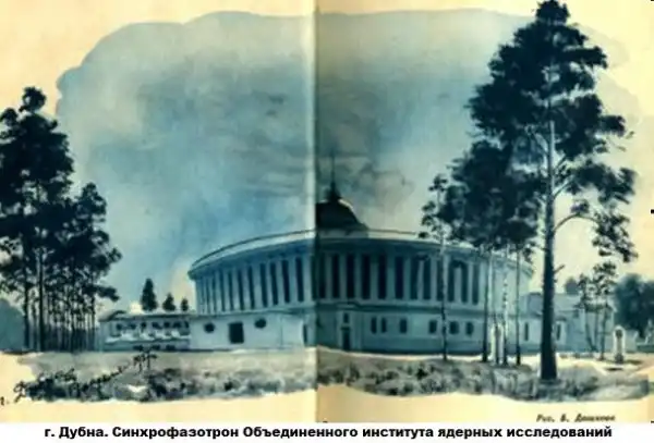 В 1956 году ИЯП и ЭФЛАН составили основу созданного Объединенного института ядерных исследований (ОИЯИ). Место его расположения стало называться городом Дубна. К тому моменту энергия протонов на синхроциклотроне составляла 680 МэВ, а строительство синхрофазотрона завершалось. С первых дней образования ОИЯИ стилизованный рисунок здания синхрофазотрона (автор В.П. Бочкарев) стал его официальным символом.