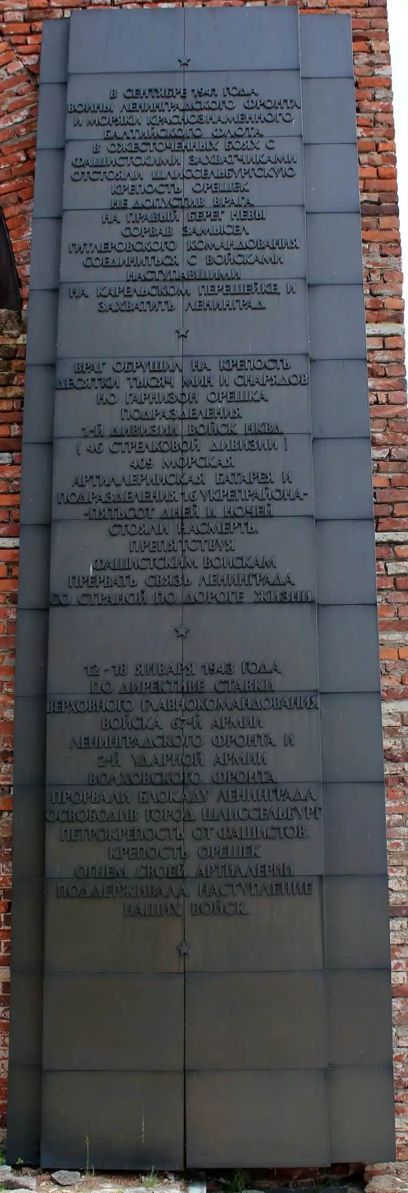 8 сентября 1941 года немцы захватили город Шлиссельбург на левом берегу Невы. Началась блокада Ленинграда. Крепость Орешек оказалась на передней линии Ленинградского фронта. Почти 500 дней с 8 сентября 1941 года по 18 января 1943 года гарнизон из 350 бойцов стойко оборонялся. Несмотря на многочисленные попытки, предпринятые фашистскими войсками, им не удалось переправиться на правый берег Невы.