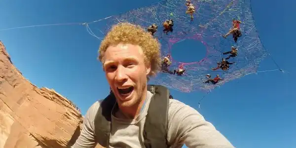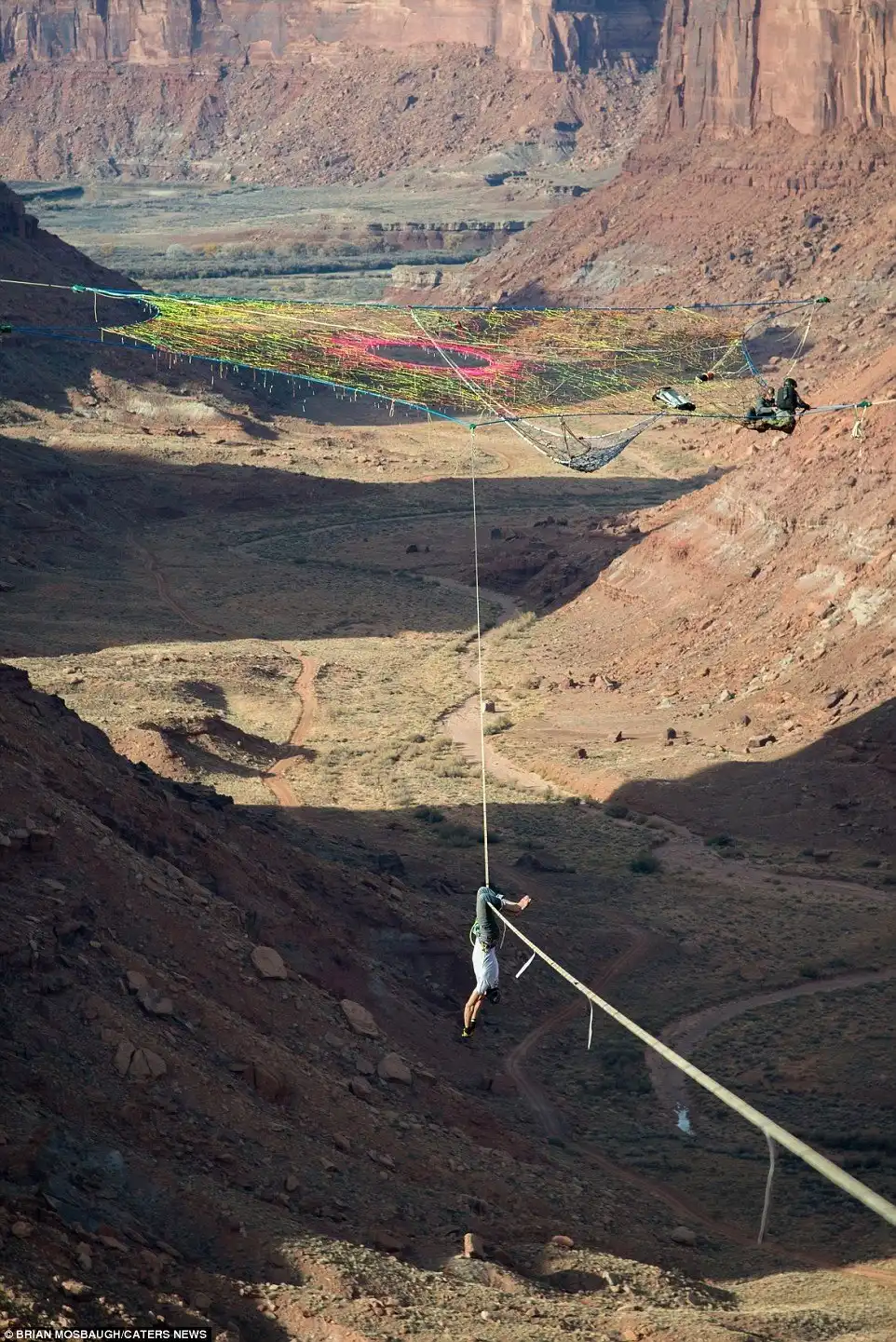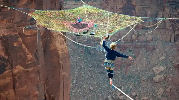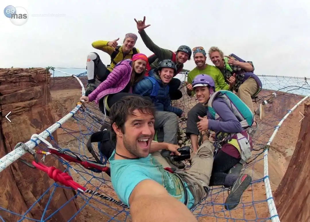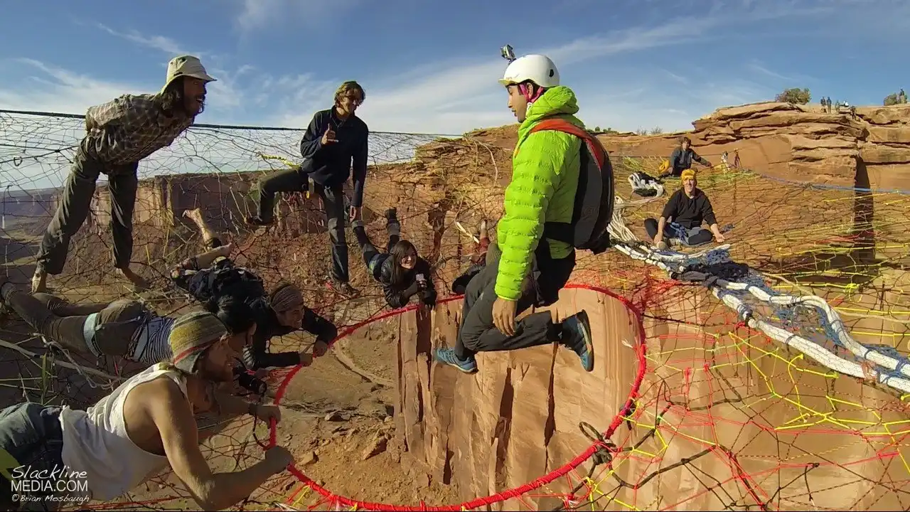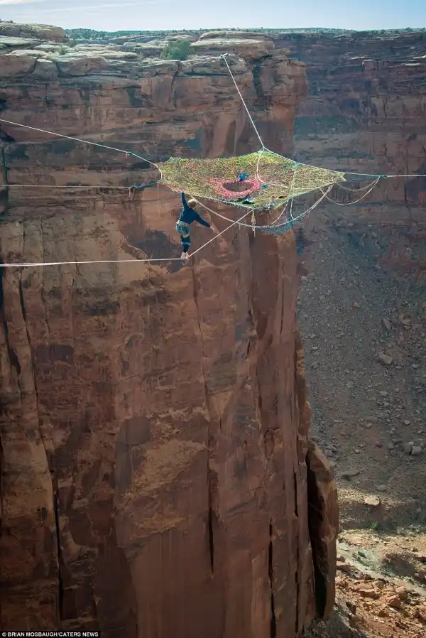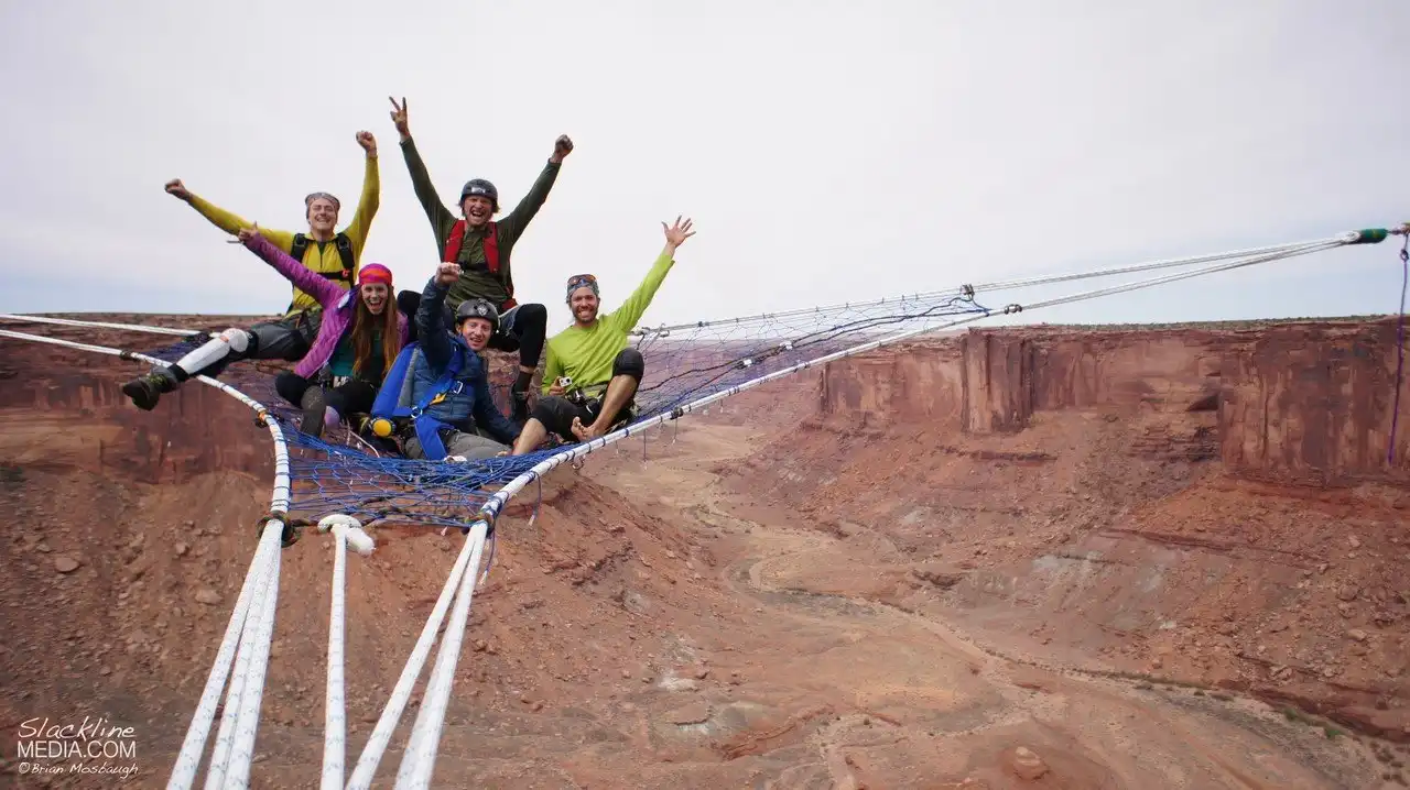 Они должны были пройти 120 метров по натянутому канату, расслабиться перед базовым прыжком, насладиться прекрасными видами и сделать фотографии. В итоге, они по очереди ныряли с парашютом в каньон через отверстие этой сетки. Moab Monkeys — специалисты по слэклайну, хайлайнингу, бейсджампингу и кинопроизводству. Они выполняли свои трюки во многих местах, включая Рио и австрийские Альпы.
