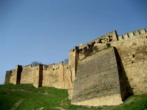 Наиболее интересен, поистине уникален и не похож ни на одну известную из сохранившихся систем городских укреплений, безусловно, сам крепостной комплекс Дербента. Главная часть системы укреплений — цитадель Нарын-кала (один из вариантов перевода этого названия на русский язык — «Солнечная крепость»), построенная на высоком отроге Джалганского хребта в VI веке. Мощные трехметровой толщины стены, ограничивающие территорию площадью 4,5 гектара, сложены из двух рядов хорошо обработанных каменных блоков с заполнением из рваного камня и известкового раствора. Такую же конструкцию имеют и параллельные стены города, северная более ранней постройки, и южная, возведенная позже. Обе стены имеют многочисленные башни. Когда-то эти стены уходили далеко в море, препятствуя обходу города по мелководью и создавая удобную и хорошо защищенную гавань.