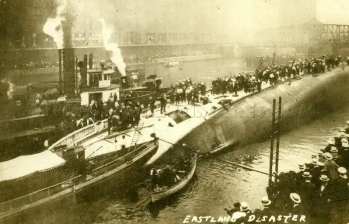 После того, как в 1912 году затонул «Титаник», США приняли Акт о Моряках, который требовал, чтобы суда оснащались должным количеством спасательных шлюпок. Пассажирский пароход «Истлэнд» (Eastland) был модифицирован с тем, чтобы разместить требуемое количество спасательных шлюпок, но это прибавило ещё груза к уже сверхтяжёлому судну. Последовавшая неизбежная беда по иронии судьбы убила больше пассажиров на «Истлэнде», чем на «Титанике», причём катастрофа произошла не в открытом море, а на городской реке, и так близко от пристани, что до него можно было добросить камень.