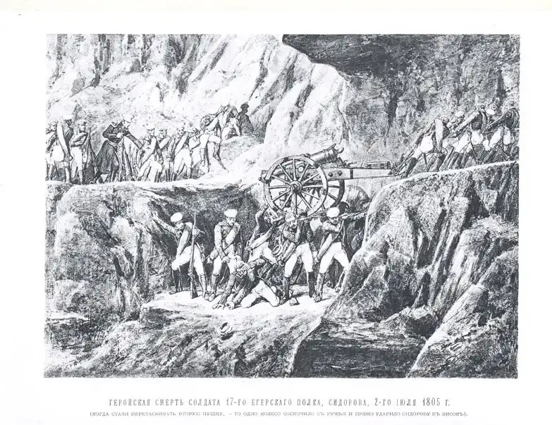Первое орудие как птица перелетело на другую сторону, второе сорвалось и колесо ударило рядового Сидорова в висок. Похоронив героя, отряд продолжил свой марш. Есть несколько версий этого эпизода: «…отряд продолжал движение, спокойно и беспрепятственно, пока находившиеся при нем, две пушки не были остановлены небольшим рвом. Леса, чтобы сделать мост, по близости не было; четверо солдат добровольно вызвались пособить делу, перекрестясь легли в ров и по ним перевезли орудия Двое остались живы, а двое за геройское самопожертвование заплатили жизнью».