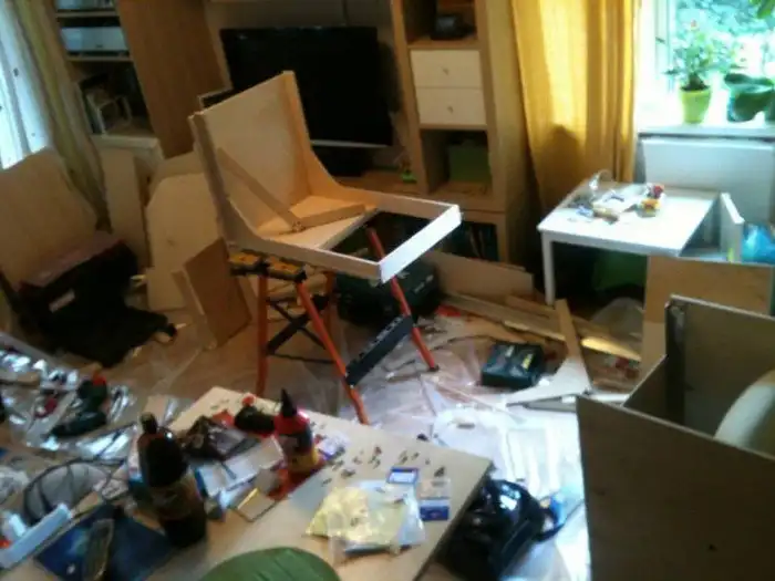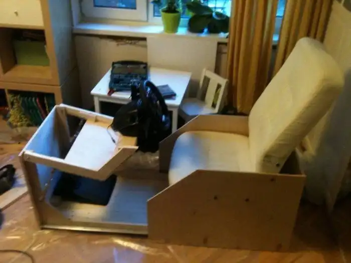 Среди любителей компьютерных и консольных игр порой находятся настоящие самородки, которые умеют создавать прекрасные вещи. Одним их таких умельцев является парень, который изготовил для себя раскладное гоночное кресло для автосимуляторов. В сложенном состоянии кресло представляет собой простой журнальный столик, который отлично вписывается в интерьер маленькой хрущевки.