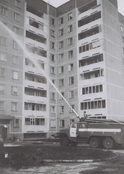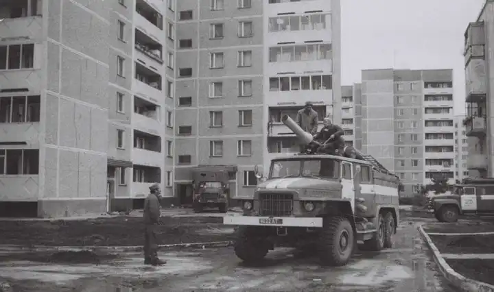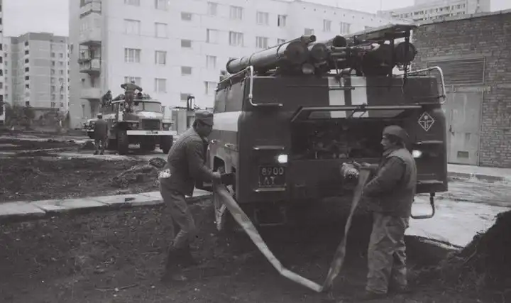 Отмывались здания с помощью вот таких специальных пожарных машин, которые давали необходимый напор. Относительно того, чем мыли — мне попадались различные версии. Кто-то пишет, что это была обычная вода, а кто-то говорит, что это был специальный полимерный состав, который при высыхании превращался в некий аналог пленки, которая связывала пыль и которую можно было потом собрать как мусор.