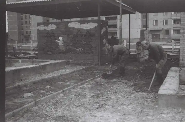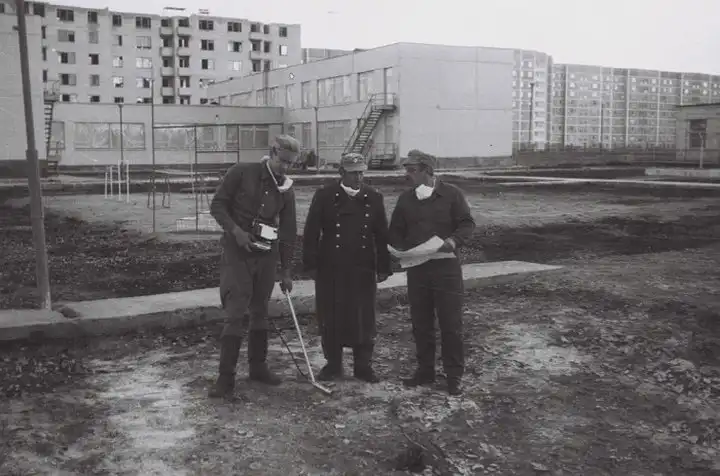 Контрольные замеры дезактивированной территории, видимо это какой-то детский сад. Интересные детали на фото — окна предполагаемого детского сада зачем-то закрыты пленкой, а в окнах последнего этажа многоэтажки на заднем плане почему-то полностью отсутствуют стекла. На счет пленки есть такое предположение — детский сад использовался в качестве общежития для ликвидаторов весной и летом 1986 года, и пленка служила дополнительным фильтром от пыли.