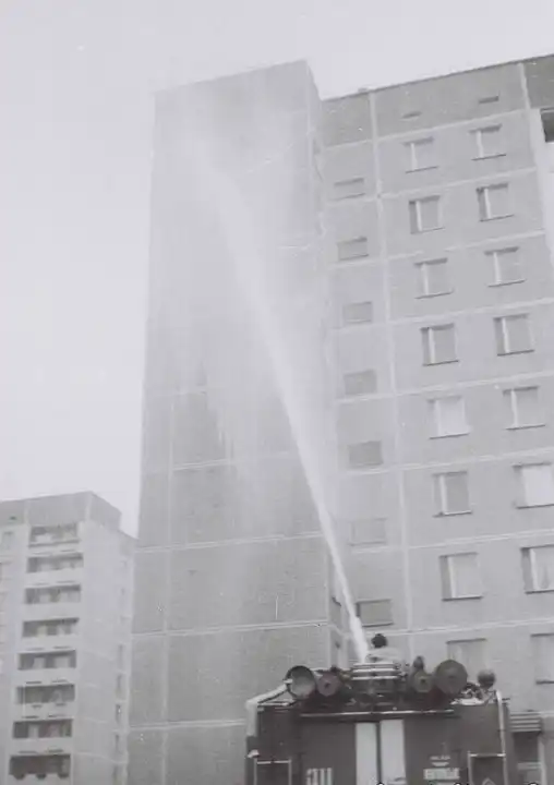 Фотоснимок процесса отмывания. Как видим, струя достаточно сильная для того, чтобы добивать до верхних этажей типового девятиэтажного дома. Думаю что силу напора приходилось регулировать в зависимости от высоты — ведь, струей такой силы, которая добивает до верхних этажей, можно легко выбить стекла нижних этажах.