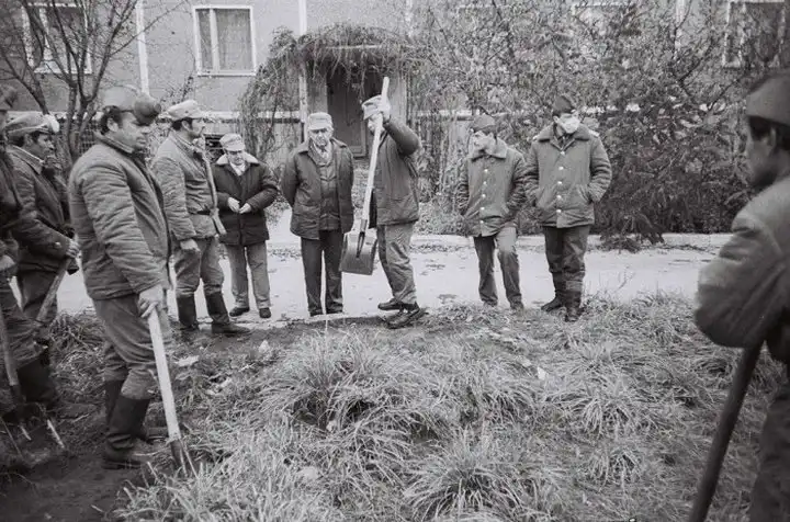Как видно на некоторых фото, грунт срезали не только лопатами, но и неким подобием мотыги (тяпками или чекменями). В середине кадра можно увидеть дозиметриста, проводящего полевые замеры экспозиционной дозы чем-то вроде военного дозиметра ДП-5.