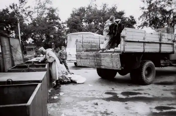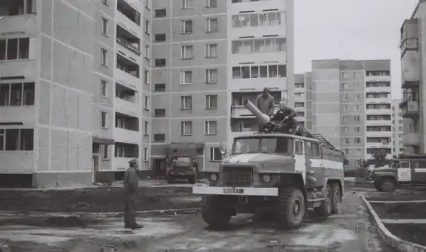 Редкий снимок — заснята работа дезинфекторов; скорее всего это поздняя осень 1986 года. Все вещи выносятся из домов (часть просто выбрасывается через окна), собирается в прицепы и кузова и вывозится в могильники.