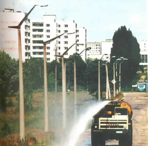 Помимо пожарных автомобилей, для отмывки зданий использовался также по крайней мере один БелАЗ, переоборудованный в поливомоечную машину УМП-1. На снимке ниже можно увидеть этот автомобиль, моющий дороги на проспекте Ленина, что проходит между Первым и Вторым микрорайонами города. Думаю что БелАЗ вначале планировалось использовать для отмывки высоких шестнадцатиэтажных зданий, но водяной компрессор был слишком сильный — по словам очевидцев, струя воды из Белаза легко выбивала в домах окна.