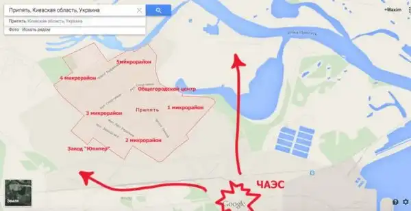Теперь давайте посмотрим на вот такую карту. На ней можно увидеть расположение города относительно ЧАЭС, плюс на карте я обозначил микрорайоны города, а также основные потоки, по которым расходились радиоактивные выбросы. В какой-то мере Припяти повезло — в дни аварии ветер сложился таким образом, что основные радиоактивные массы как бы «обогнули» город с двух сторон, образовав две линии высокого радиационного загрязнения, позже получившие название Северного и Западного следа. Даже с учетом этого экспозиционный фон в Припяти к вечеру 26 апреля составлял в среднем 1 рентген в час (примерно в 70-100 тысяч раз выше нормы); можете себе представить, каким был бы фон в Припяти, если бы потоки пошли прямо на город.