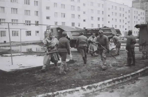 Но в основном все делалось вручную. На фото ниже группа солдат дезактивационной службы вручную собирает грунт в кузов МАЗа, фото сделано во дворе припятских общежитий в Первом либо Втором микрорайоне.