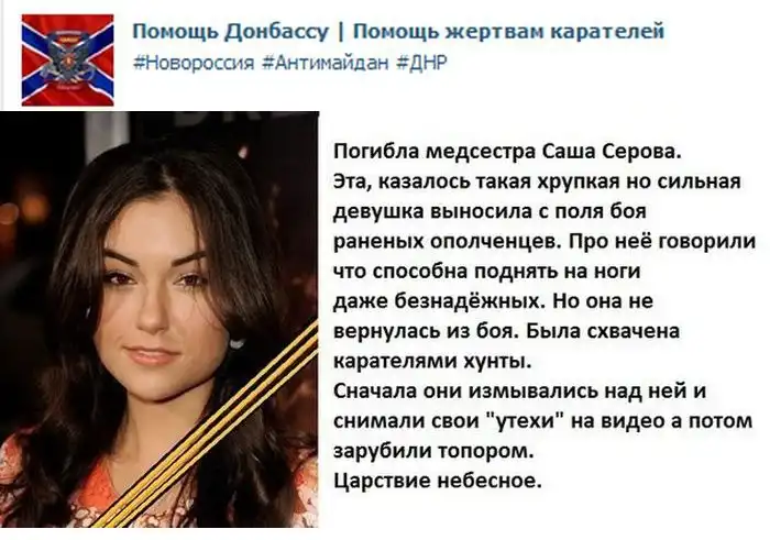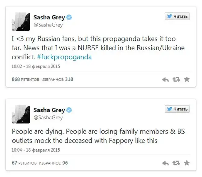 Саша Грей пишет о том, что пропаганда зашла слишком далеко, распространяя новость о ее смерти во время военного конфликта. Люди умирают и теряют членов семьи, а это просто издевательство.