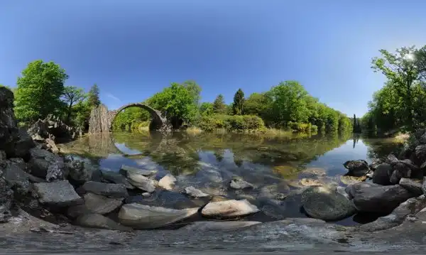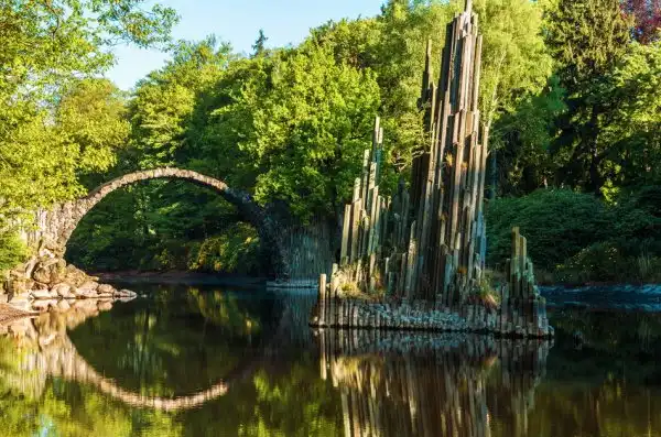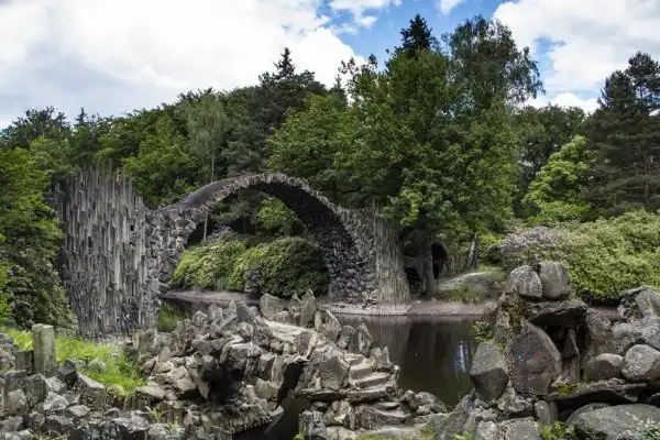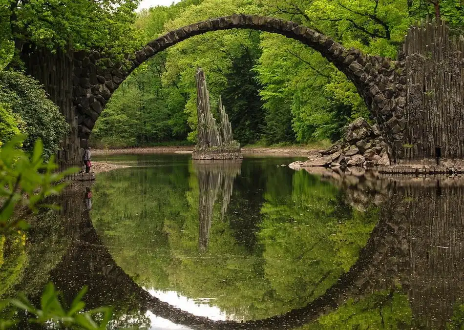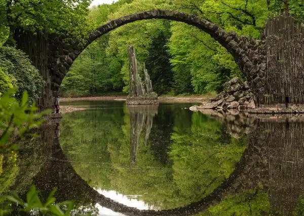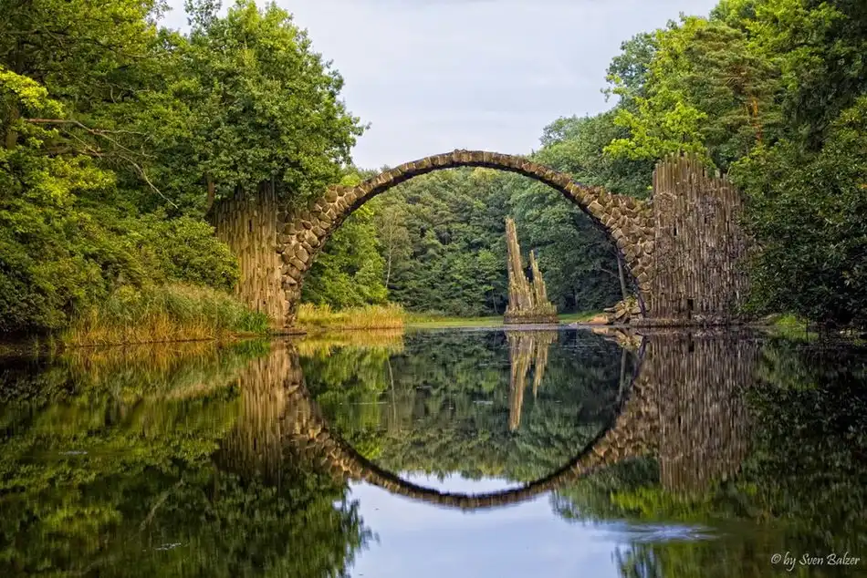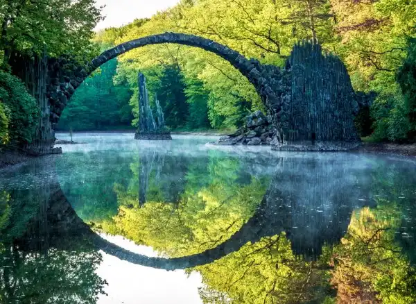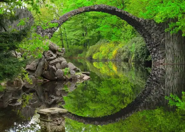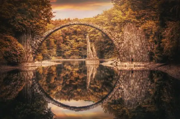 Мост Ракотцбрюке (Rakotzbrücke), также известный как Чёртов мост, находится в немецком парке Кромлау (Габленц, Саксония). Эта надводная базальтовая дуга была построена в 1860 году и по сей день поражает многих своей дьявольской точностью и живописным окружением. Мост вместе со своим отражением, при необходимом уровне воды, образует чёткую окружность, независимо от точки наблюдения.