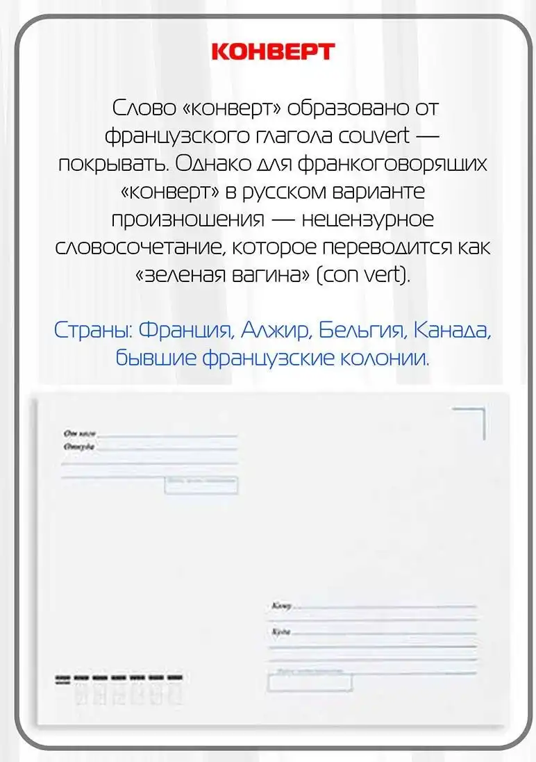 Прежде, чем ехать отдыхать за границу, стоит удостовериться не только в том, что ты на минимальном уровне знаешь, что говорить местному жителю, но и в том, что ты знаешь, чего ему говорить не надо. Ведь если ты спросишь у француженки, где тут бассейн, то вы намекнете, что у нее обвисшие титьки, а попросив у нее конверт, назовете ее зеленой вагиной. Есть еще несколько слов, за которые у вас будет крепкая потасовка с иностранцем.