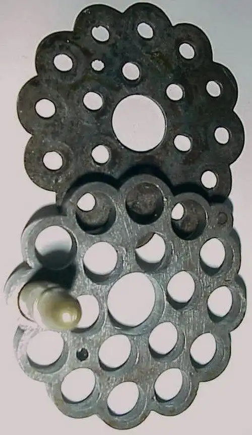 Для безопасного хранения и быстрой зарядки патронов используются два соединенных между собой диска. Патроны вставляются в один диск и закрываются другим. Это напоминает современные спидлоудеры (speedloaders).